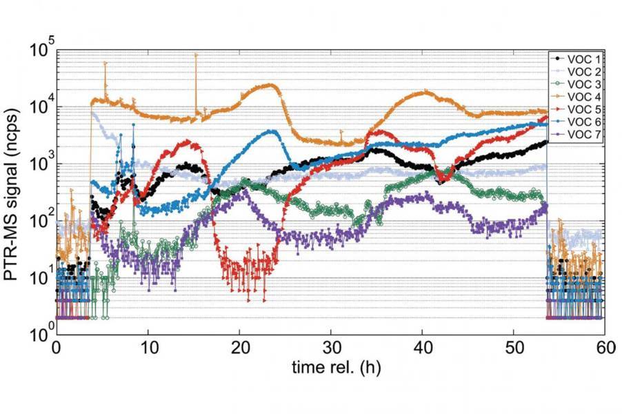 In a bioreactor, volatile organic compounds (VOCs) are emitted as metabolic by-products of microbial growth and production. Real-time monitoring of these emitted volatile metabolites in the off-gas of a bioreactor with PTR-MS allows gauging the activity of the micro-organisms for quality assurance and process control. In E. coli fermentations we observe up to 70 VOCs with notable concentrations and distinct variations over time – prominent examples are shown in the figure.