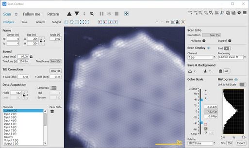 Three modes are integrated in this module: ‘Scan’, ‘Follow-me’ and ‘Spectroscopy’. All scan parameters can be adjusted on-the-fly without delay during scanning, and it is possible to zoom, navigate and paste multiple scanned images to the background for reference. Any of the 24 signals can be displayed in multiple windows. Pause then resume scan with no data loss after tip cleaning, spectroscopy, or manipulation. The motion of the tip is visualized in real-time when scanning or positioning with the mouse.